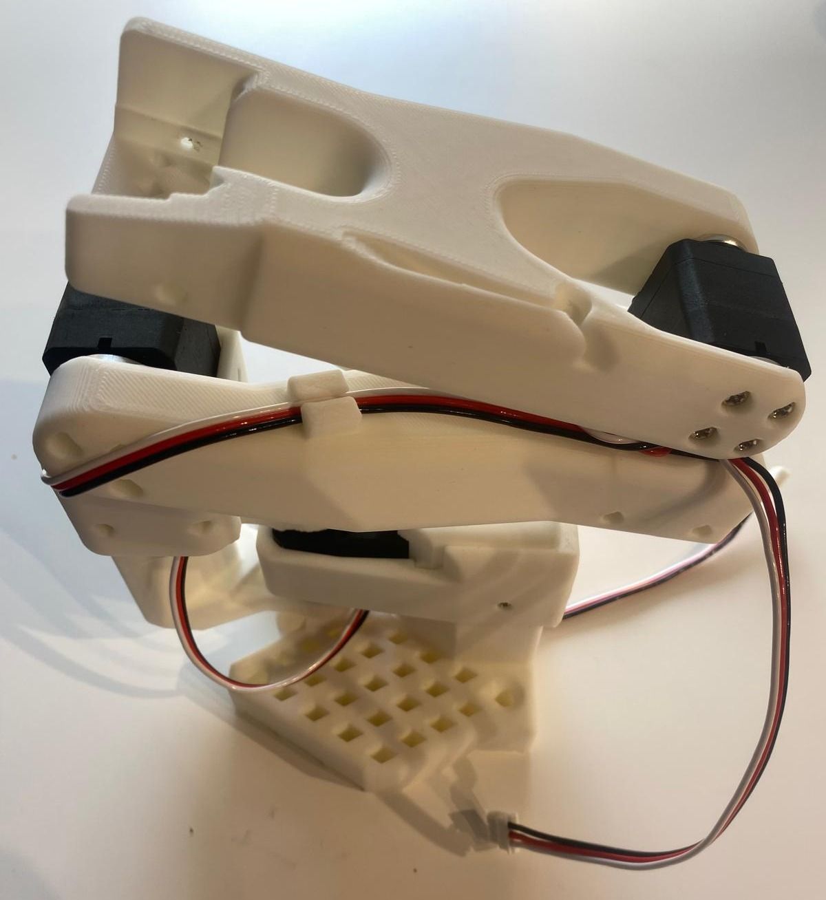 **Step 7: Attach Shoulder Part** - Route one wire to the back of the robot and the other to the left or in photo towards you (see photo). - Attach the shoulder part. **Step 8: Secure Shoulder** - Tighten the shoulder part with 4 screws on top and 4 on the bottom *(access bottom holes by turning the shoulder).* --- ### Second Motor Assembly **Step 9: Install Motor 2** - Slide the second motor in from the top and link the wire from motor 1 to motor 2. **Step 10: Attach Shoulder Holder** - Add the shoulder motor holder. - Ensure the wire from motor 1 to motor 2 goes behind the holder while the other wire is routed upward (see photo). - This part can be tight to assemble, you can use a workbench like the image or a similar setup to push the part around the motor.